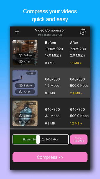 Video Compressor เป็นแอปพลิเคชัน iPhone ฟรีที่พัฒนาโดย 80 Degree Photo Studio Co. Ltd. มันให้คำตอบที่ง่ายและมีประสิทธิภาพสำหรับผู้ใช้ที่มีปัญหาเกี่ยวกับพื้นที่จัดเก็บบนอุปกรณ์ของพวกเขาเนื่องจากวิดีโอที่มากเกินไป ด้วย Video Compressor ผู้ใช้สามารถบีบอัดและปรับแต่งวิดีโอของพวกเขาได้อย่างง่ายดาย ลดขนาดได้ถึง 80% หรือมากกว่านั้น